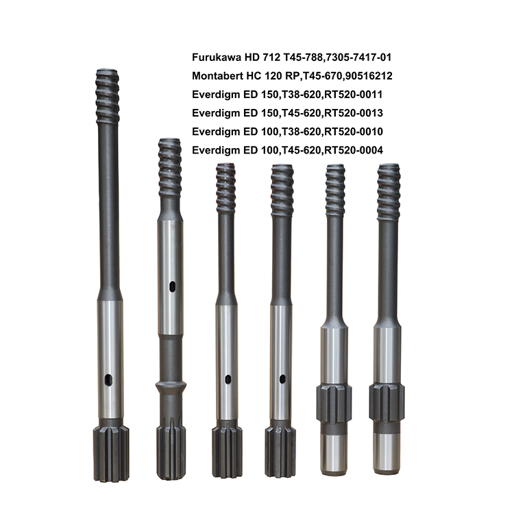 Different shank adapters are available, like Atlas Copco, Tamrock, Ingersoll Rand,etc. Also for the same drill machine, due to different applications, the shank adapters can be different length and different threads.